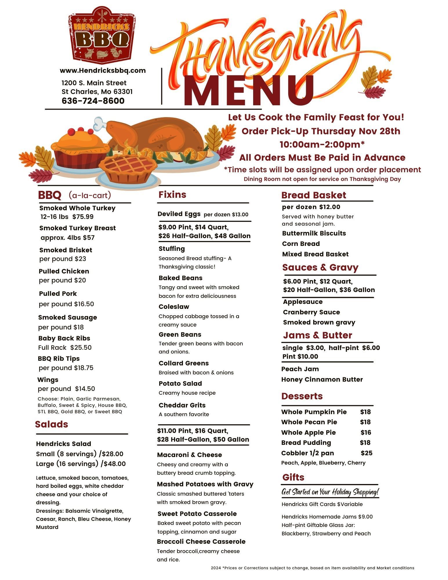 In Person- place your order at Hendrick’s BBQ on 1200 S Main Street St. Charles